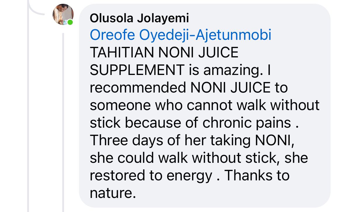 As a Junior secondary school student, Oreofe got her hand injured while playing with friends in school and since then, she lived with a very painful lump. All efforts to reduce this lump proved abortive. She was introduced to the Tahitian Noni drink and on her 4th day of using the juice, she stopped feeling the pain and the painful lump has reduced drastically. She kept monitoring and within 4 weeks, the lump become totally invisible.